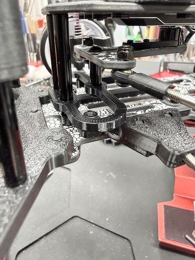 The steering damper is a 3D-printed part made from PEBA filament, which makes it highly flexible, resembling a large rubber band. The attachment point to the steering plate is offset, ensuring that when the servo is powered up and centered, the damper applies tension. However, it’s flexible enough to allow the servo to make a full steering sweep.